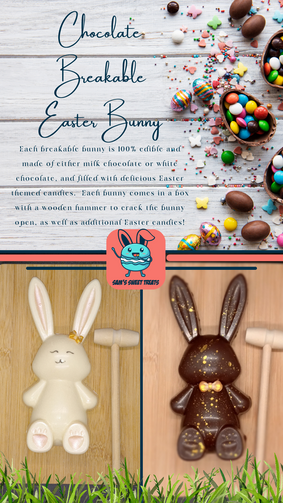 Your choice of either a milk chocolate or white chocolate hollow bunny filled with Easter themed candy, and gift packed in a cute box with 1 wooden hammer to break the bunny as well as additional Easter themed candies.